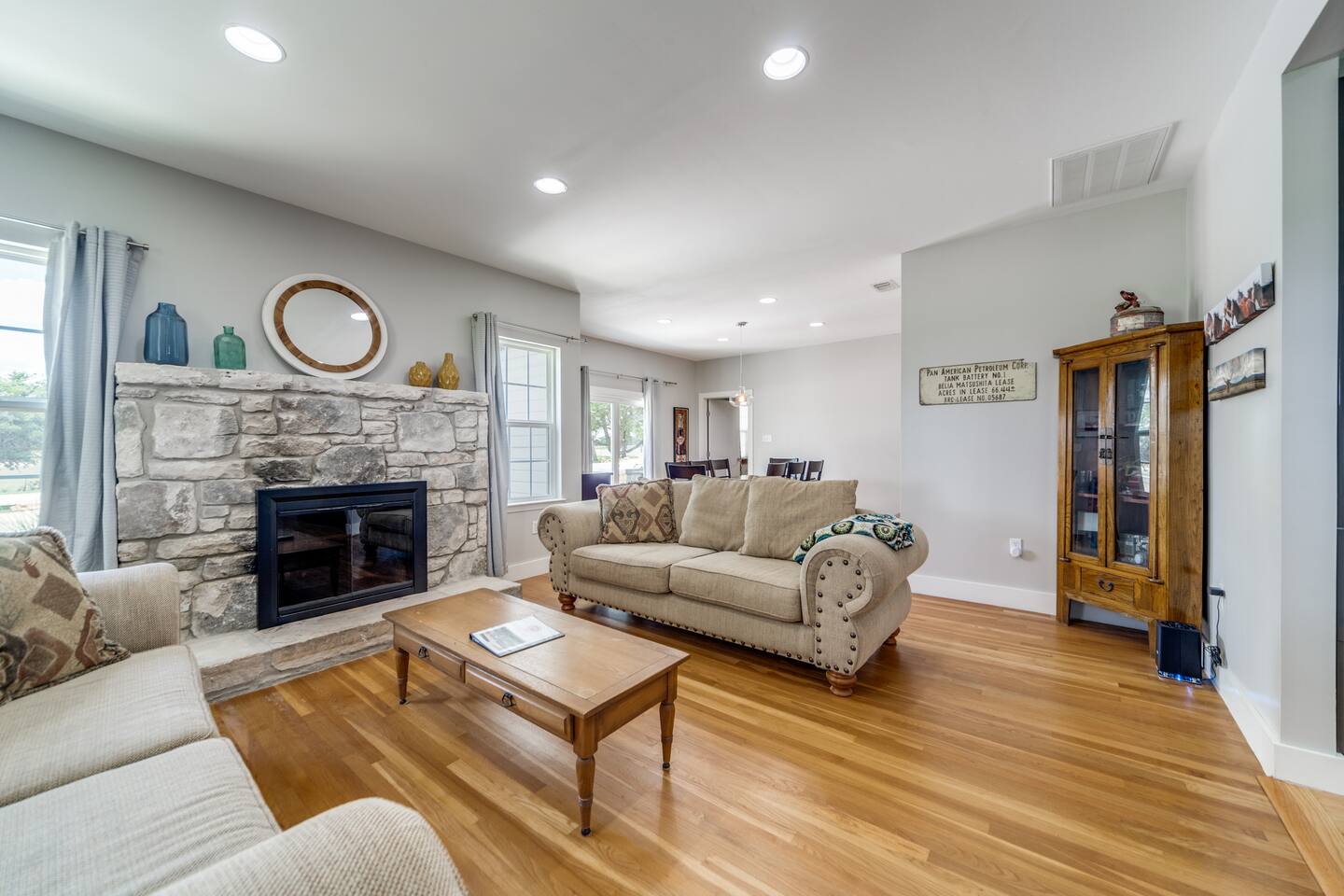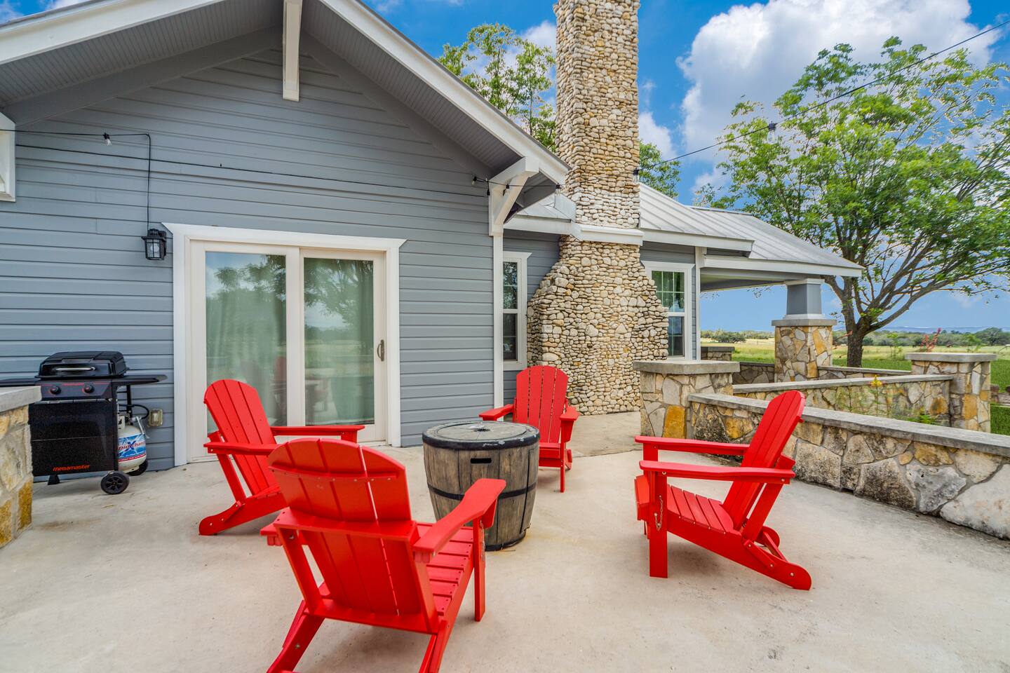 We have a beautiful wrapping porch that has gorgeous views of the hill country with a nice breeze. We also have a natural and propane fire pit to enjoy underneath the stars. Grill your meal on our patio for a memorable group gathering.